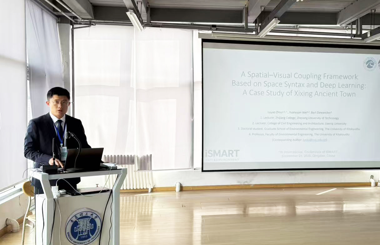 周璐瑶教师在会议分论坛上作了题为《A Spatial–Visual Coupling Framework Based on Space Syntax and Deep Learning: A Case Study of Xixing Ancient Town》的学术报告。报告系统介绍了其基于空间句法与深度学习语义分割的空间—视觉耦合研究框架,探讨传统聚落空间结构与视觉感知之间的量化关系,为传统水乡聚落的空间优化与更新提供了新的分析方法与理论参考。会议期间,周璐瑶教师还主持Architectural Design分会场,与来自中国、日本、泰国等国家的学者就可持续建筑设计、环境适应性空间营造及建筑遗产保护等议题展开深入交流与讨论。