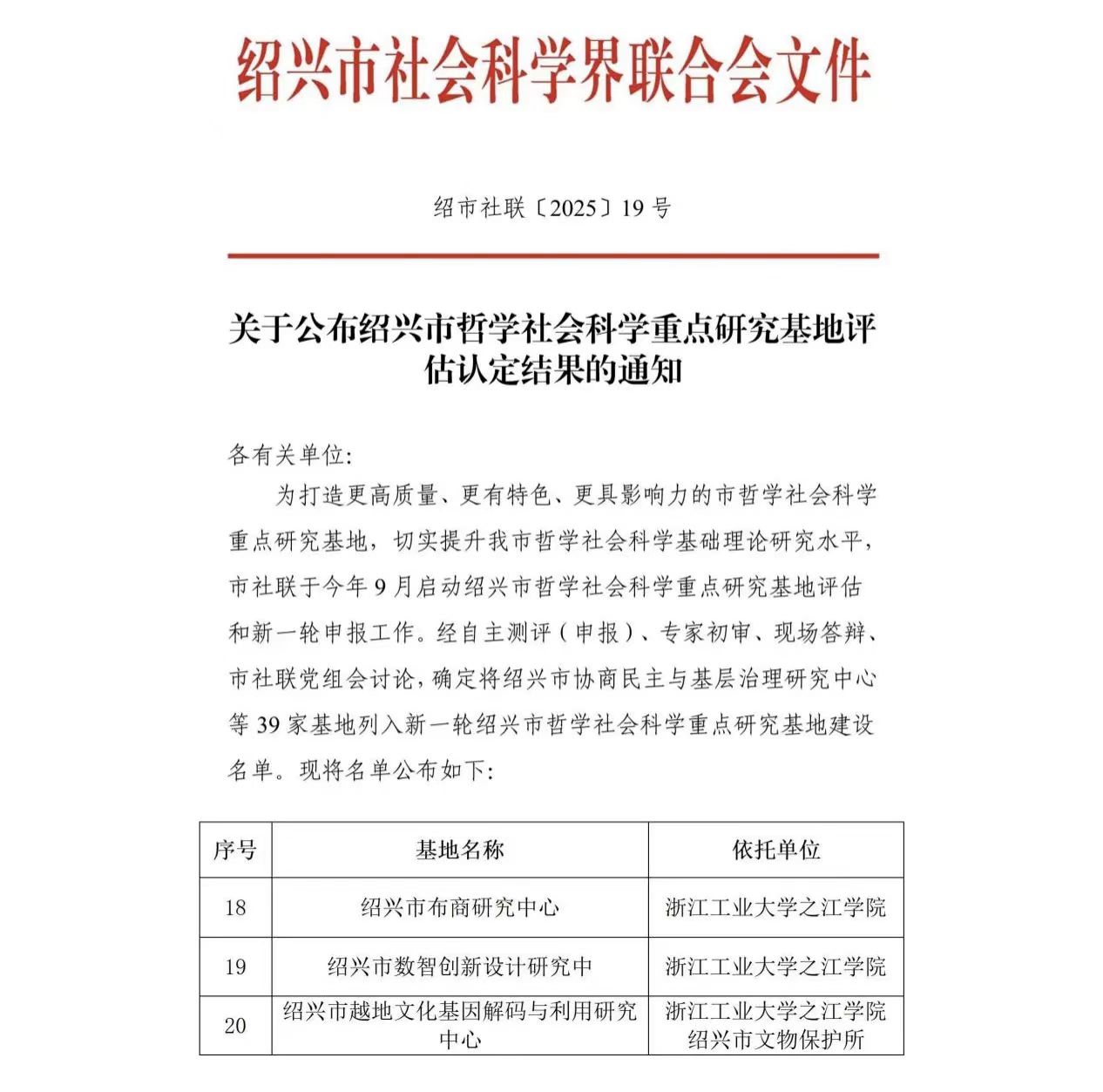 近期,由建筑学院与市文物保护所联合申报的“绍兴市越地文化基因解码与利用研究中心”获批为绍兴市社科重点研究基地(绍市社联[2025]19号),该中心整合文史、哲学、艺术、传媒、生态、旅游、建筑、管理等多学科领域的研究人员,聚焦越地文化基因的系统梳理与解码、越地文化传承创新与区域发展互动、越地文化遗产数字化保护与传播等三个方向展开研究。学院师生可依托该平台申报市厅级专项课题、开展教学科研竞赛等相关工作。